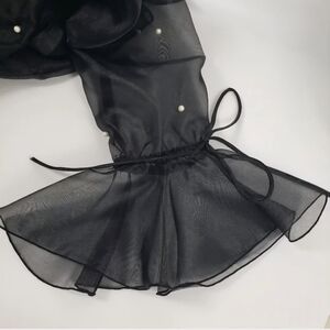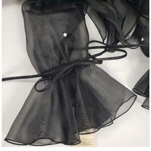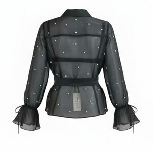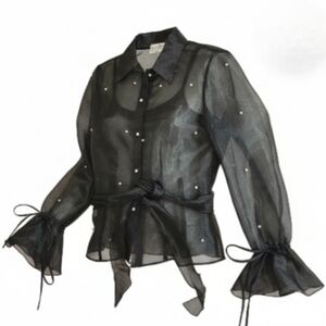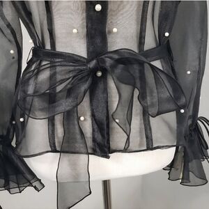 Joseph Ribkoff Black Sheer Organza Blouse Faux Pearls Bell Sleeve Tie Waist NWT4