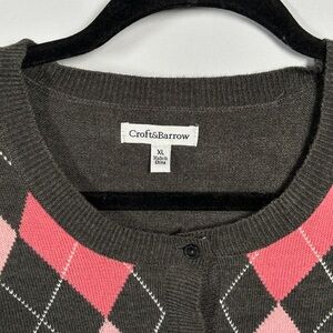 argyle cardigan, croft & barrow cardigan, classic knit cardigan, pink gray sweater, preppy knitwear, button front cardigan, cozy fall layers, academia style sweater, womens xl cardigan, lightweight acrylic knit, soft knit cardigan, heritage sweater look, charcoal cardigan womens, everyday layering knit, timeless womens sweater, winter outfit ideas, office casual cardigan, pink argyle top, vintage inspired cardigan, fall wardrobe staple, feminine preppy style, layering sweater womens, classic argyle knit