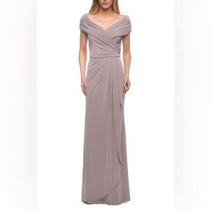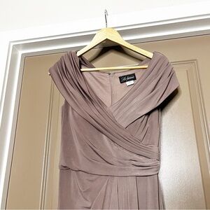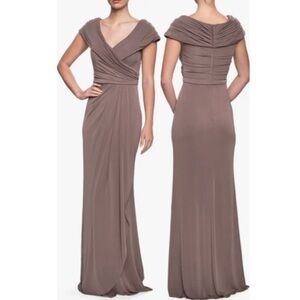 LA FEMME Ruched Jersey Column Gown Cocoa Brown