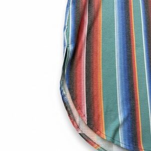 This lightweight knit top features a bold, vertical stripe pattern reminiscent of a Serape or Mexican blanket, with rich colors including teal/mint, burnt orange, navy, and coral. It has a classic scoop neck and 3/4 length sleeves.