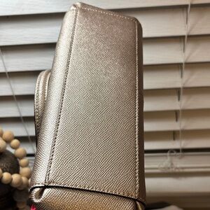 Coach Metallic Platinum Gold Leather Mini Christie Carryall Stylish shoulder bag by Coach. Includes a chic chain strap and decorative scarf. Gold hardware in great condition. She has two zip compartments on each side and a roomy center compartment. Interior is a rich brown color.no call ours on this girl.