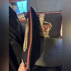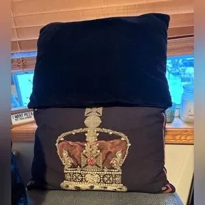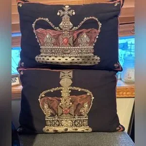 Elegant decorative pillows featuring a royal crown design. Perfect for adding a touch of luxury to any room. Zippered cases with velvet and embroidery. Excellent quality. 16” Long 12” Tall