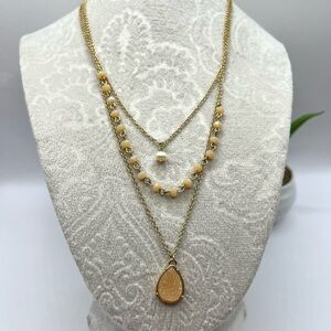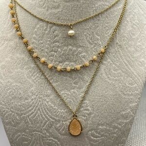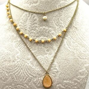 Layered Light Pink Peach Necklace Gold Tone Drusy Beads and Center Pearl Boho