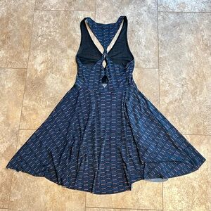 Flirty, strappy skater dress with a navy and orange pattern. Sleeveless top with cutouts in the sides and back, a black lining, and a flared skirt. Perfect for casual outings or a cute little date night! Would fit a small as well- very forgiving.