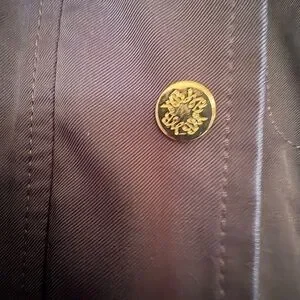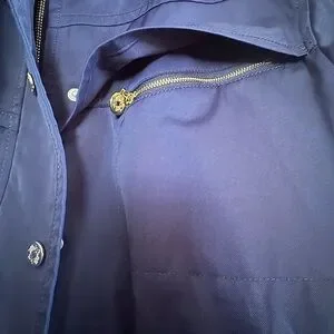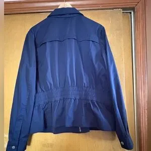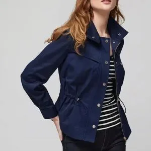 Chic navy utility jacket with drawstring waist. Features button and zip closure. Ideal for versatile styling.