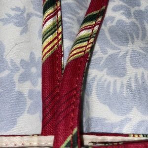 Longaberger Holiday Lined Gift Bag-With Front Pocket- 7-3/4” x 4-1/4” x 9” tall. Tans, burgundy’s, greens, cream. Striped bag. Fully lined in cream. 2 handles. Great for the holidays.
