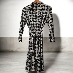 A petite women's midi faux wrap dress by INC International Concepts featuring a black and white houndstooth print. This dress showcases a classic collared neckline and long sleeves, cinched at the waist with a matching fabric tie belt for a flattering silhouette.
