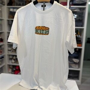 White tee with a playful cookie graphic. Casual and trendy style.
