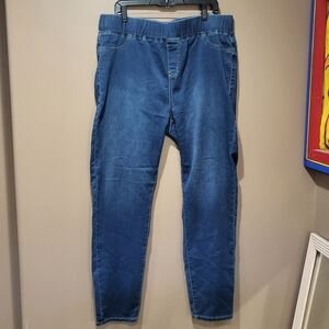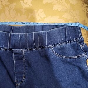 Avenue high waisted pull on tapered skinny jeans. Measures about 18" flat across the waist, 13" along the front rise and 31" along inseam.