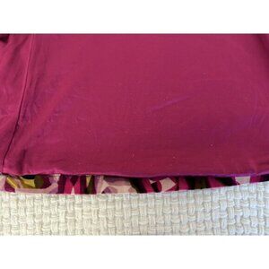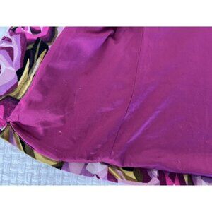 Purple, pink, and green abstract floral print. Velvety material. Size 2T-3T. Good condition overall, but considerable pilling of the lining.