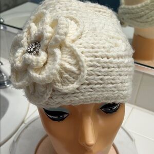 Elegant Cream Knit Flower headband with rhinestone detail