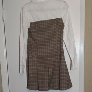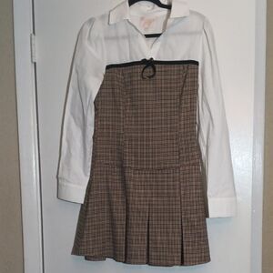 Charming dress with brown plaid design. Features a classic white collar and long sleeves. Ideal for formal occasions. Used in good condition