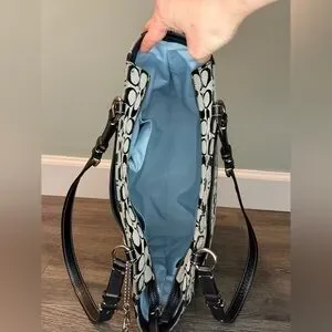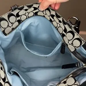 2009 Coach Signature Tote with baby blue interior. Comes with original hangtag and features front, back, and interior pockets. The side pockets feature turn locks! Please note a few callouts from normal wear- slight scratching to hardware, scratching on bottom leather, and some bottom corner wear. Interior is super clean!