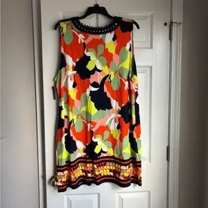 Bold floral mini dress with vibrant colors. Sleeveless design with intricate neckline detail. Perfect for a lively look.