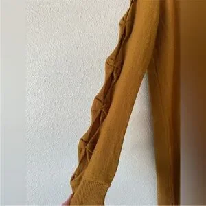 NWT knit sweater dress featuring unique braided cutout sleeves. Perfect for a cozy and chic look. PTP is 21”-24”. Length is 37”. Tag says M but will also fit L.