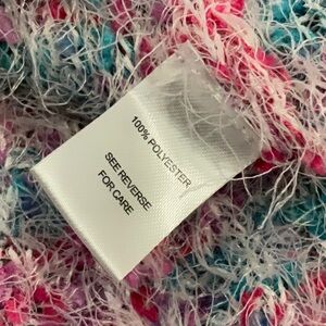 Cozy fuzzy sweater with a multicolor design. Features a blend of pink, blue, and white hues. Perfect for a stylish and warm look.
