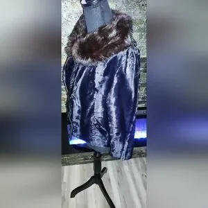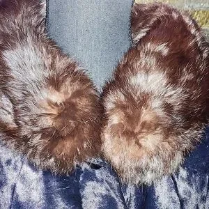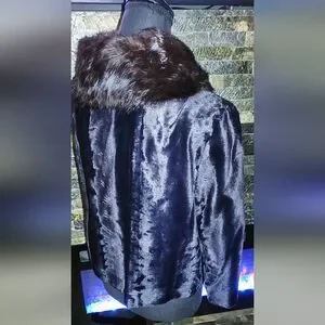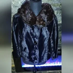 This vintage fur coat with a mink collar from A Winter Product is a size Large, perfect for the winter season. The overcoat features a button closure, fur trim accents, and a collared neckline. Made from fur with a polyester lining, this classic style coat is ideal for formal occasions or parties. The brown and black color combination, along with the 3/4 sleeves and short length, make it a timeless piece that exudes elegance and sophistication.