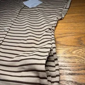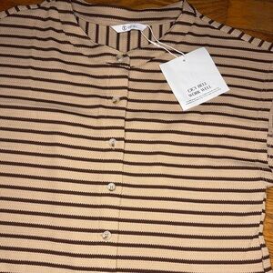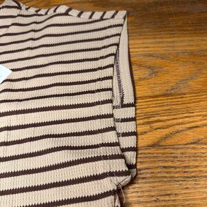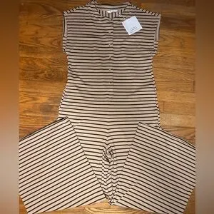 Stylish sleeveless jumpsuit with black and tan stripes. Perfect for casual outings. New with tags! Wide leg! In the color “khaki”!