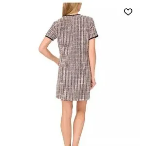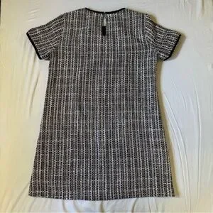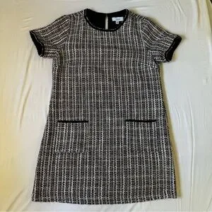Cute CeCe tweed mini dress with gold tinsel-like threads and patch pockets. Fitted through the chest and arms; sits away from the body through the waist and hips. Can work for the office or a date. Could also look cool and grunge with the right accessories.