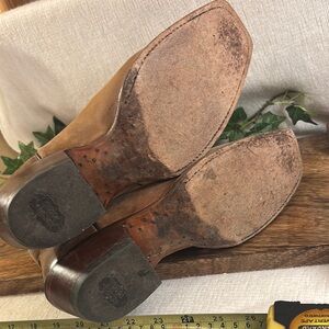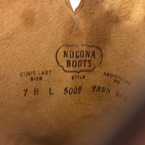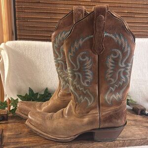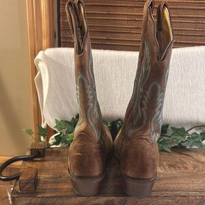 Stylish Nocona heeled boots. Brown leather with blue embroidery. Perfect for any occasion.