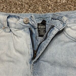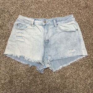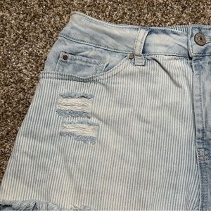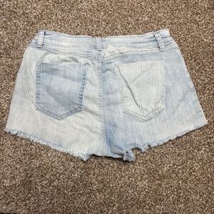 Stylish light blue jean shorts with a striped pattern. Features distressed accents and a frayed hem. Ideal for casual outings. Please see photos for measurements