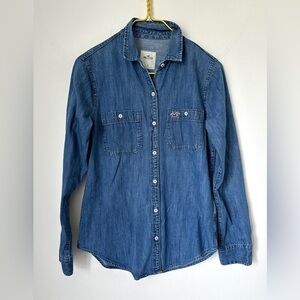 Hollister Blue Cotton Denim Long Sleeve Button Up Logo Jean Shirt Women’s Small