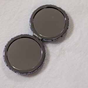 New, Round decorative mirror with intricate blue and red patterns. Features sparkling accents.
