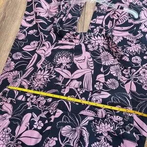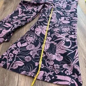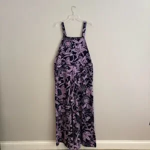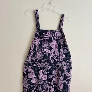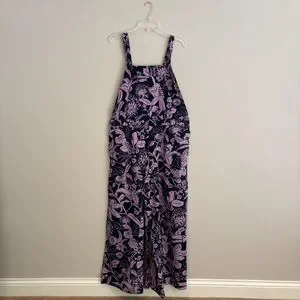 Wide leg/ bell bottom overall jumpsuit with adjustable straps and buttons on both sides at waist. Purple print on a navy background. Reposhing these because they are WAY too long on me and the amount I would need to hem them would ruin the gorgeous bell bottom silhouette! One of you tall girlies is gonna love these. RUNS SMALL. Fits more like a Large imo. I would say best for a size 12 if you want them to fit loose or a 14 for a closer fit.