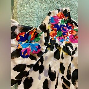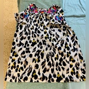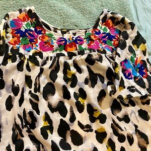 Stylish leopard print dress with gold, featuring vibrant floral embroidered accents. Double lined. This slip on piece has pleated front and back neck lines. Super cute and versatile; can be worn as a dress or tunic for taller ladies. Would be compatible with a cute pair of western boots , go go, bots or shoeties. Or take it up a notch, pair this beauty up some black pumps!