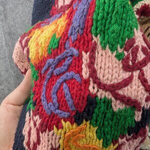 Vibrant knit cardigan featuring playful patterns, buttons, and a mix of colors. Perfect for adding a fun touch to any outfit.