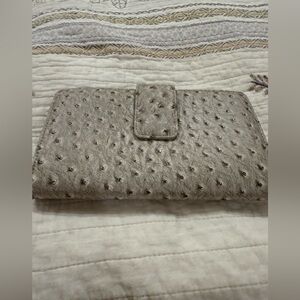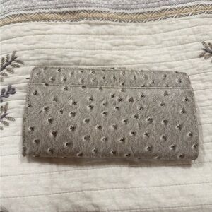 In excellent condition ostrich design faux leather wallet. Gray color, snap enclosure. From smoke free home.