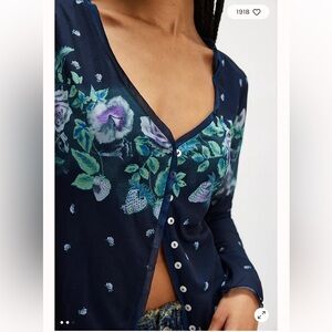 Stylish navy blouse with floral design. Features button-up front. Long sleeves with a fitted look. Fits true to size to a Medium or just a little loose for a Small. Super cute! Would look great with a paper bag skirt (see my closet) or barrel jeans!