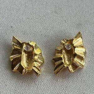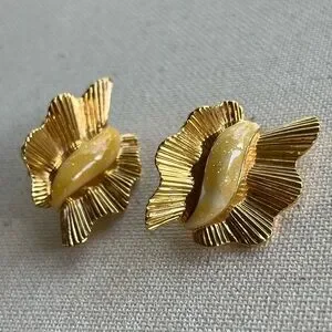 Stunning and unique, these vintage earrings feature a textured gold-tone ruffle design with a shimmery golden enamel center. The glitter detail adds just the right amount of sparkle, making them perfect for both everyday glam and special occasions.