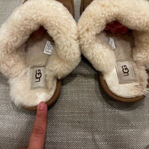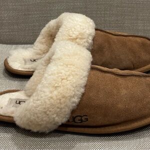 Soft tan slippers with plush cream lining. Ideal for cozy comfort. Size 9. Some lining missing as shown in the pictures. Overall good condition.