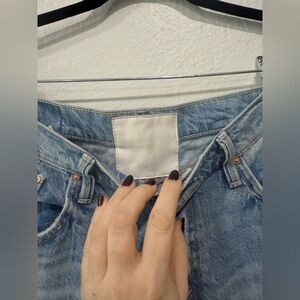 The MOTHER the Down Low Spinner Hover Jeans are crafted from mid-weight, non-stretch denim. These ankle-length jeans feature distressed holes, button closure, zip fly, and five-pocket styling. Measurements from size 24 are: 9.75in/25cm rise, 28.25in/72cm inseam, and 20.5in/52cm leg opening. The jeans are made of 100% cotton and made in the USA.