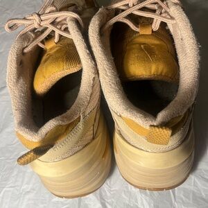 Nike shoes featuring a tan and mustard color scheme. Ideal for everyday comfort.