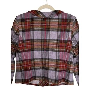 Lands' End wool plaid jacket in size 10 with a lilac-lavender base and mixed plaid in olive, red, and pink tones. The cropped, tailored silhouette and rounded collar give it a classic, polished look suited for workwear, cool-weather errands, dinners, and preppy or academia-leaning wardrobes. The hook-and-eye front closure and full lining make it structured and easy to style with trousers, denim, or skirts. The wool fabric has a soft feel and the multicolor plaid works well as a statement layer.