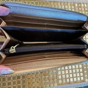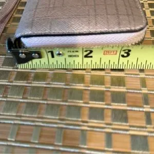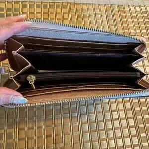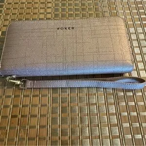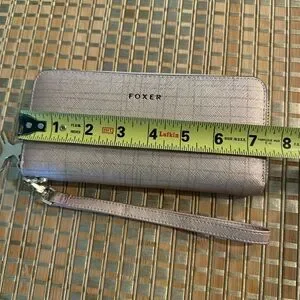 Foxer Leather Long Wristlet Clutch. Women's long wallet is made of genuine saffiano cowhide leather. The wallet is designed to hold ID, credit cards, cash and coins. Women’s zip around wallet comes with 2 cash compartments, 2 bill compartments, 1 zipper coin pouch and 8 card slots, meeting your daily needs. Wristlet strap is detachable to use as a clutch or to drop in your purse to use as a wallet. Approximately 7.5” x 3.5”. Color is Rose Gold. New unused.