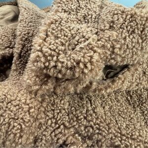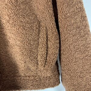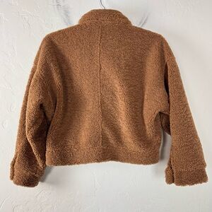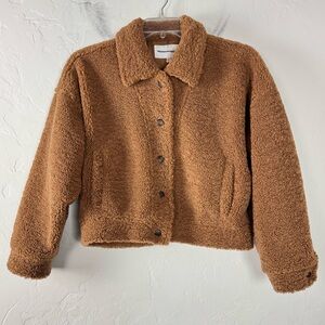 Cupcakes and Cashmere womens size medium teddy jacket coat in a solid dark brown color. Collared with full snap button down front. Long sleeves with button cuff hem. Boxy cropped fit. Side pockets. Fully lined. Super soft plush fleece style fabric in 100% polyester, no stretch. Gently worn. Only flaw is one cuff missing the button. No replacement available. No others.