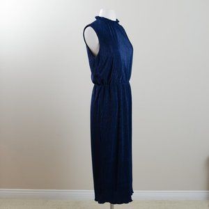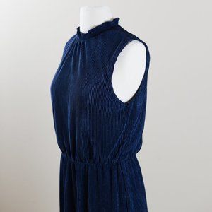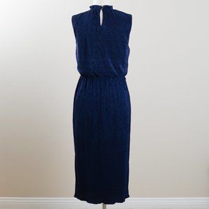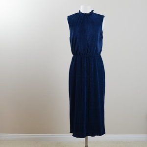 Chic pleated midi dress. Sleeveless with ruffled neckline. Perfect for any occasion.