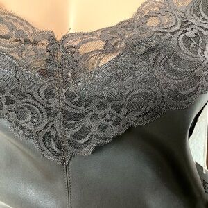 Amazing lace trim over the vegan leather front with plunging V-neckline.
