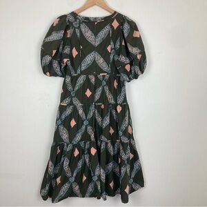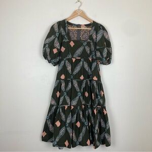 Ulla Johnson army green boho print tiered dress. Quilted bodice. Side pockets. Knee or midi length depending on height. Size 6 based on measurements.