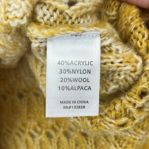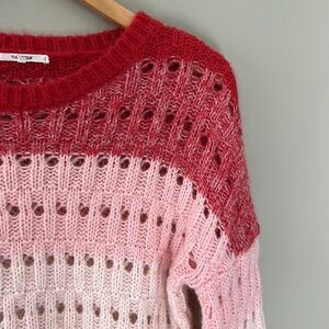 Loose/open weave chunky knit. Bell/flared sleeves. Multicolor stripe in red/pink/off-white/mustard yellow.