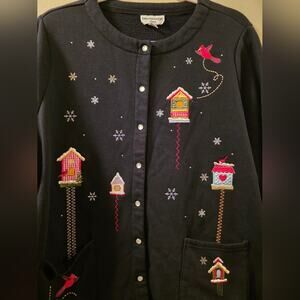 Vtg Winter Cardinal Embroidered Cardigan Sweater Holiday 2X Bird Black Red