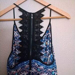 Daniel Rainn tank style shorts romper. Size - XS. Romper has blue, pink, white, black & yellow "tie dye", batik style design with black spaghetti straps and beautiful black crochet panel down the back. Elastic waistband w/side pockets. Zipper closure down center back. 100% polyester. Super cute & in good shape! Perfect for last month of summer!
