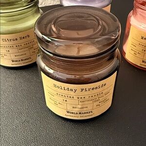 Set of four scented candles in glass jars. Includes Citrus Herb, Lavender Musk, Holiday Fireside, and Merry Pinkmas. Perfect for creating a cozy atmosphere.