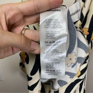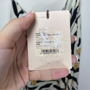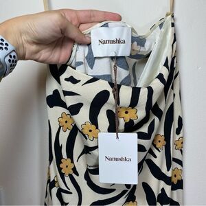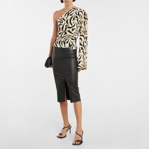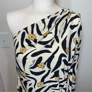 Stylish one-shoulder blouse. Features bold black and cream pattern. Accented with orange floral design. Perfect for a chic look.