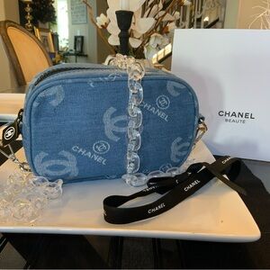 Authentic Chanel Denim Cosmetics Pouch, available exclusively as a gift with certain purchases. This stunning pouch features durable denim material with Chanel’s signature elegance. Its compact size makes it perfect for carrying your beauty essentials in style. A rare and beautiful multi-functional accessory that adds a touch of luxury to any collection.