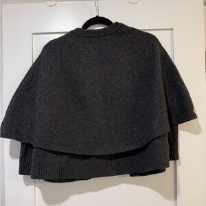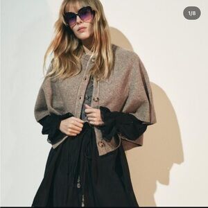 Short sleeve round neck jacket with a cape. Ribbed trims. Button-up front.