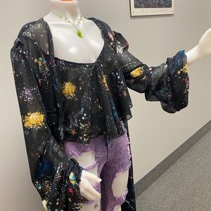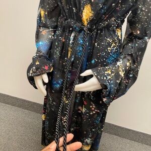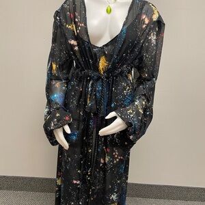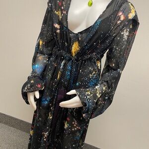 Looking for an outfit that demands presence? This Galaxy print drawstring robe will create artistic aura to your wardrobe as fell as offer well needed comfort. It comes with elastic gathered lantern sleeves and measures 50” overall in length. This piece also works as a perfect bathing suit cover up.